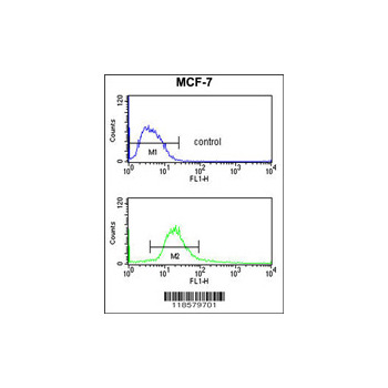 - POLDIP2 Antibody (C-term) flow cytometry analysis of MCF-7 cells (bottom histogram) compared to a negative control cell (top histogram).FITC-conjugated goat-anti-rabbit secondary antibodies were used for the analysis.