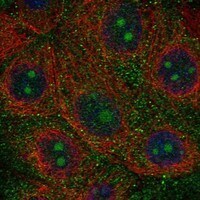 - Immunofluorecent analysis of NWD1 in human cell line MCF7 using NWD1 Polyclonal Antibody (Product # PA5-140335). Staining shows localization to nucleoli and cytosol.
