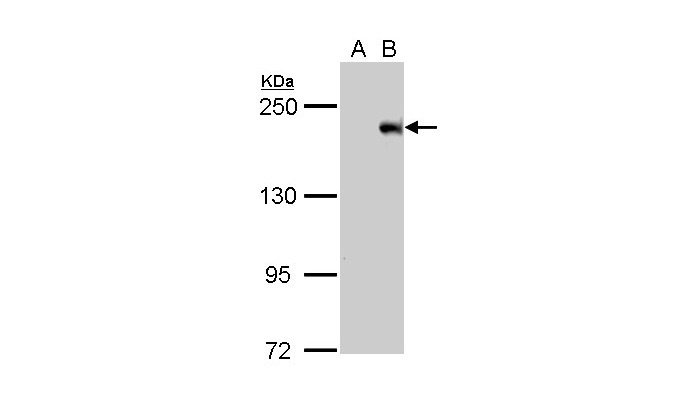 - C3 antibody detects C3 protein by western blot analysis.A. 30 ?g 293T whole cell lysate/extractB. 30 ?g whole cell lysate/extract of human C3-transfected 293T cells5 % SDS-PAGEC3 antibody (OAGA00087) dilution: 1:20000