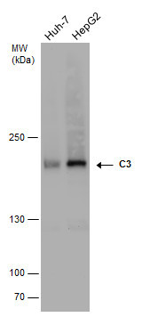 - C3 antibody detects C3 protein by western blot analysis. Various whole cell extracts (30 ?g) were separated by 5% SDS-PAGE, and the membrane was blotted with C3 antibody (GTX101316) diluted at a dilution of 1:1000. The HRP-conjugated anti-rabbit IgG antibody (GTX213110-01) was used to detect the primary antibody.