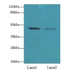 - Western blot. All lanes: FAM46B antibody at 6 ug/ml. Lane 1: 293T whole cell lysate. Lane 2: HeLa whole cell lysate. Secondary Goat polyclonal to Rabbit IgG at 1:10000 dilution. Predicted band size: 47 kDa. Observed band size: 47 kDa.