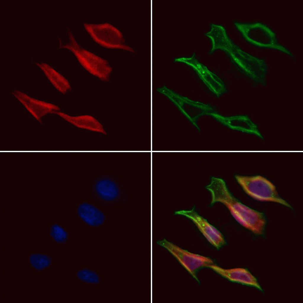 - Immunofluorescent analysis of CCZ1B in HeLa cells. Samples were fixed with paraformaldehyde, permeabilized with 0.1% Triton X-100, blocked with 10% serum (45 min at 25°C), incubated with mouse anti-beta tubulin and CCZ1B polyclonal antibody (Product # PA5-102070) using a dilution of 1:200 (1 hr, 37°C), and followed by goat anti-rabbit IgG Alexa Fluor 594 (red) and goat anti-mouse IgG Alexa Fluor 488 (green).