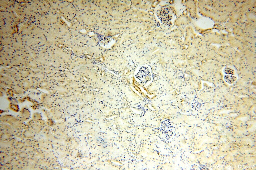 - Immunohistochemistry of paraffin-embedded human kidney using 14943-1-AP (OVCA2 antibody) at dilution of 1:50 (under 10x lens).
