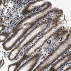 - Immunohistochemical staining of human stomach shows moderate cytoplasmic and nuclear positivity in glandular cells.