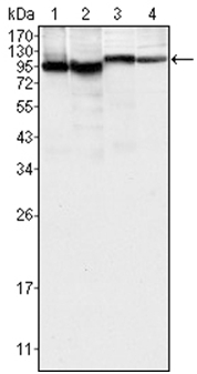 - Western blot analysis using BTK antibody Cat.-No AM06170SU-N against K562 (Lane 1), MCF-7 (Lane 2), Jurkat (Lane 3) and HEK293 (Lane 4) cell lysate.