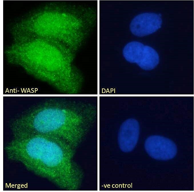 - Immunocytochemistry analysis of WASP using WASP Polyclonal Antibody (Product # PA5-18354) in paraformaldehyde fixed U2OS cells, permeabilized with 0.15% Triton. Primary incubation 1hr (10 µg/mL) followed by Alexa Fluor 488 secondary antibody (2 µg/mL), showing nuclear and cytoplasmic staining. The nuclear stain is DAPI (blue). Negative control: Unimmunized goat IgG (10 µg/mL) followed by Alexa Fluor 488 secondary antibody (2 µg/mL).
