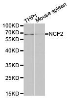 - Western blot analysis of THP1 cell and mouse spleen cell lysate using NCF2 antibody.