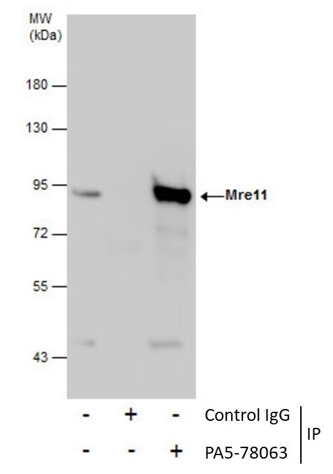 - Immunoprecipitation of Mre11 was performed in HeLa whole cell extracts using 5 µg of MRE11 Polyclonal Antibody (Product # PA5-78063). Samples were transferred to a membrane and probed with MRE11 Polyclonal Antibody as a primary antibody and an HRP-conjugated anti-Rabbit IgG was used as a secondary antibody.