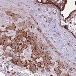 - Immunohistochemistry-Paraffin: WDR90 Antibody [NBP2-31888] - Staining of human placenta shows moderate to strong membranous positivity in decidual cells.