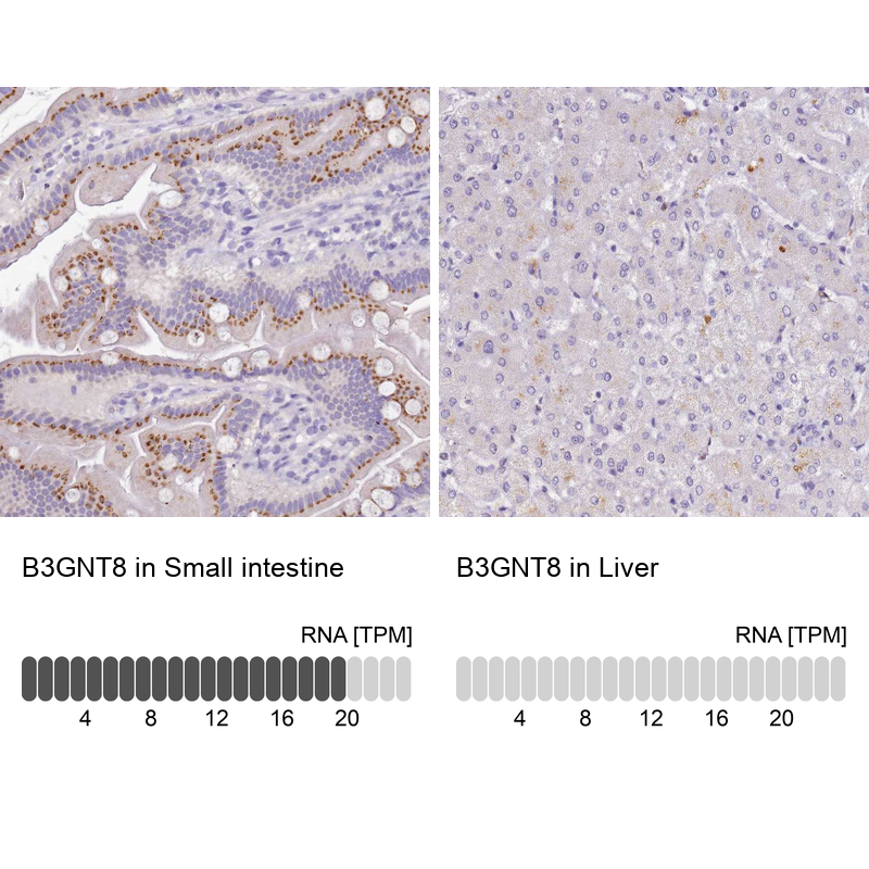 - Immunohistochemistry analysis in human small intestine and liver tissues using Anti-B3GNT8 antibody. Corresponding B3GNT8 RNA-seq data are presented for the same tissues.
