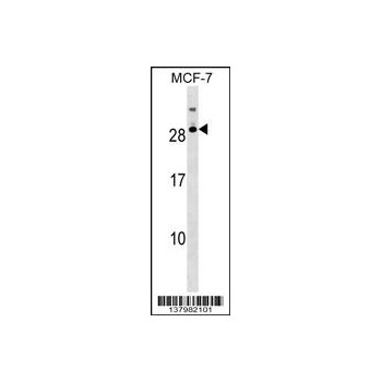 - RNASE11 Antibody (Center) (Cat. # OAAB13277) western blot analysis in MCF-7 cell line lysates (35µg/lane). This demonstrates the RNASE11 antibody detected the RNASE11 protein (arrow).