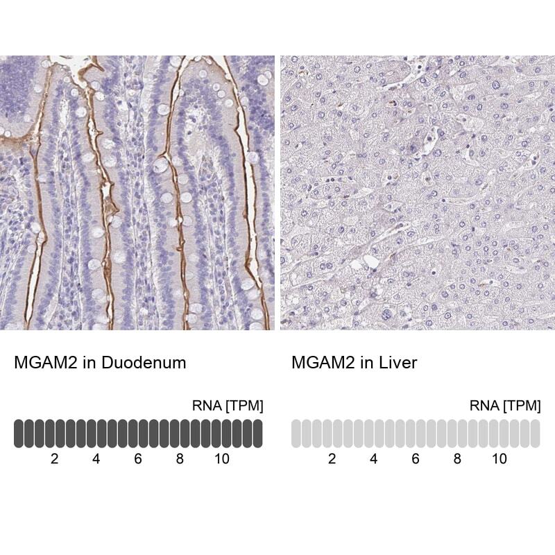 - Immunohistochemical staining of Maltase-Glucoamylase in human duodenum and liver tissues using Maltase-Glucoamylase Polyclonal Antibody (Product # PA5-63162). Corresponding MGAM2 RNA-seq data are presented for the same tissues.