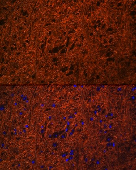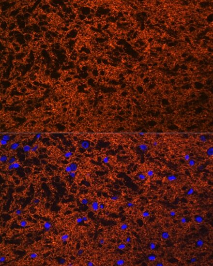 - Immunohistochemistry (Immunofluorescence) analysis of SNAP25 in mouse brain. Samples were incubated with SNAP25 Polyclonal antibody (Product # PA5-87549) using a dilution of 1:100 (40x lens). Blue: DAPI for nuclear staining.