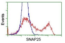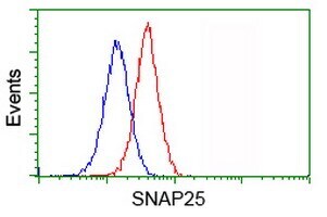 - HEK293T cells transfected with either RC202068 overexpress plasmid (Red) or empty vector control plasmid (Blue) were immunostained by anti-SNAP25 antibody (TA502970), and then analyzed by flow cytometry.