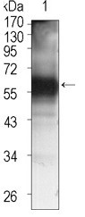 - Western blot analysis using TEC mouse mAb against TEC (aa90-240)-hIgGFc transfected HEK293 cell lysate (1).