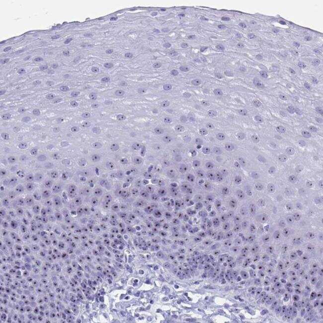 - Immunohistochemical analysis of TBC1D29 in human esophagus using TBC1D29 Polyclonal Antibody (Product # PA5-63678) shows moderate nucleolar positivity in squamous epithelial cells.