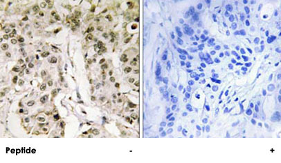 - Immunohistochemistry analysis of paraffin-embedded human breast carcinoma tissue, using HCFC1 polyclonal antibody (Cat # PAB17367).Peptide "+" means "with peptide blocking".