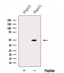 - Western blot analysis of extracts of HepG2 cells using DOC2B antibody. The lane on the left was treated with blocking peptide.