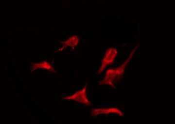 - Immunofluorescent analysis of OR2AJ1 in HeLa cells. Samples were fixed with paraformaldehyde, permeabilized with 0.1% Triton X-100, blocked with 10% serum (45 min at 25°C) incubated with OR2AJ1 polyclonal antibody (Product # PA5-102122) using a dilution of 1:200 (1 hr, 37°C), and followed by goat anti-rabbit IgG Alexa Fluor 594 at a dilution of 1:600.