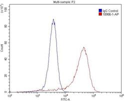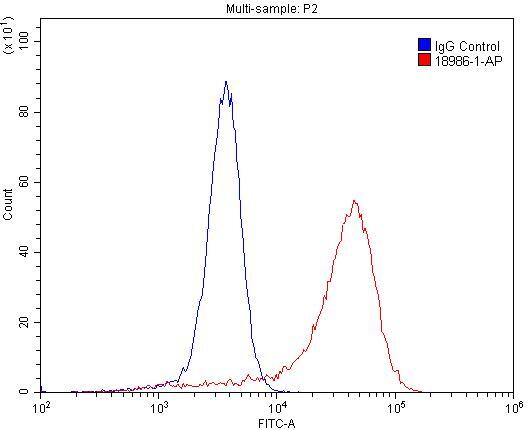 - 1X10^6 A431 cells were stained with .2ug EGFR-Specific antibody (18986-1-AP, red) and control antibody (blue). Fixed with 4% PFA blocked with 3% BSA (30 min). Alexa Fluor 488-conjugated AffiniPure Goat Anti-Rabbit IGG (H+L) with dilution 1:1500.