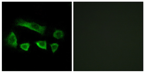 - Immunofluorescence analysis of A549 cells, using NT5C1B antibody. The picture on the right is treated with the synthesized peptide.