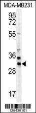 - ZNF321 Antibody (N-term) (Cat. #AP11412a) western blot analysis in MDA-MB231 cell line lysates (35ug/lane).This demonstrates the ZNF321 antibody detected the ZNF321 protein (arrow).