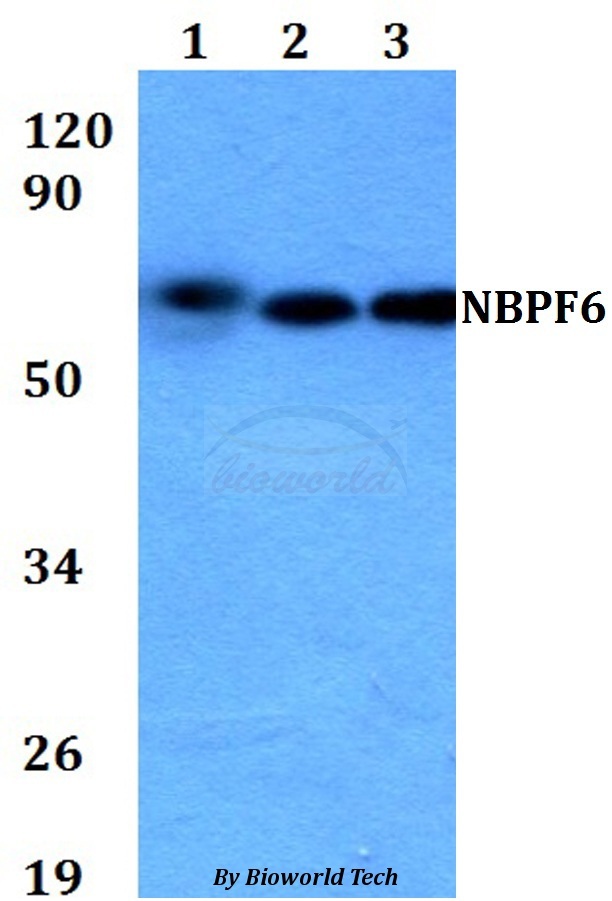 - Western blot of NBPF6 antibody at 1:500 dilution. Lane 1: HEK293T whole cell lysate. Lane 2: Raw264.7 whole cell lysate. Lane 3: H9C2 whole cell lysate.