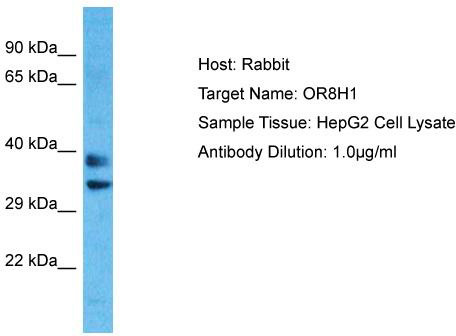 - Host: Rabbit; Target Name: OR8H1; Sample Tissue: HepG2 Whole Cell lysates; Antibody Dilution: 1.0ug/ml