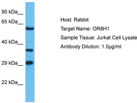 - Host: Rabbit; Target Name: OR8H1; Sample Tissue: Jurkat Whole Cell lysates; Antibody Dilution: 1.0ug/ml