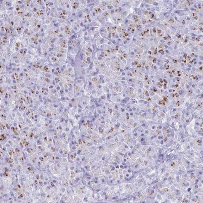 - Immunohistochemical analysis of SDR42E2 in human pancreas using SDR42E2 Polyclonal Antibody (Product # PA5-63941) shows strong cytoplasmic (dot-like) positivity in exocrine glandular cells.