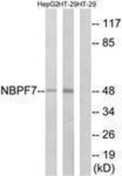 - Western blot analysis of extracts from HT-29/HepG2 cells, using NBPF7 Antibody. The lane on the right is treated with the synthesized peptide.