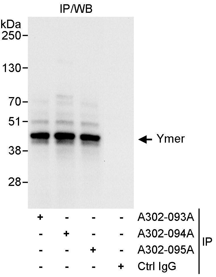 - Detection of human Ymer by western blot of immunoprecipitates. Samples: Whole cell lysate (1 mg for IP, 20% of IP loaded) from HeLa cells. Antibodies: Affinity purified rabbit anti-Ymer antibody A302-093A used for IP at 3 µg/mg lysate. Ymer was also immunoprecipitated by rabbit anti-Ymer antibodies A302-094A and A302-095A, which recognize downstream epitopes. For blotting immunoprecipitated Ymer, A302-094A was used at 1 µg/ml. Detection: Chemiluminescence with an exposure time of 3 seconds.