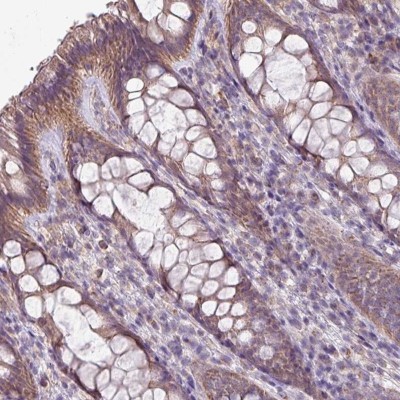 - Immunohistochemistry-Paraffin: LRRC9 Antibody [NBP2-34176] - Staining of human colon shows moderate cytoplasmic positivity in glandular cells.
