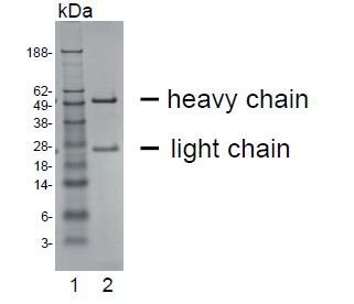 - SDS-PAGE analysis of purified HT-12D8 monoclonal antibody. Lane 1: molecular weight marker, Lane 2: 2 ?g of purified HT-12D8 antibody. Proteins were separated by SDS-PAGE and stained with RAPID StainTM Reagent.