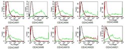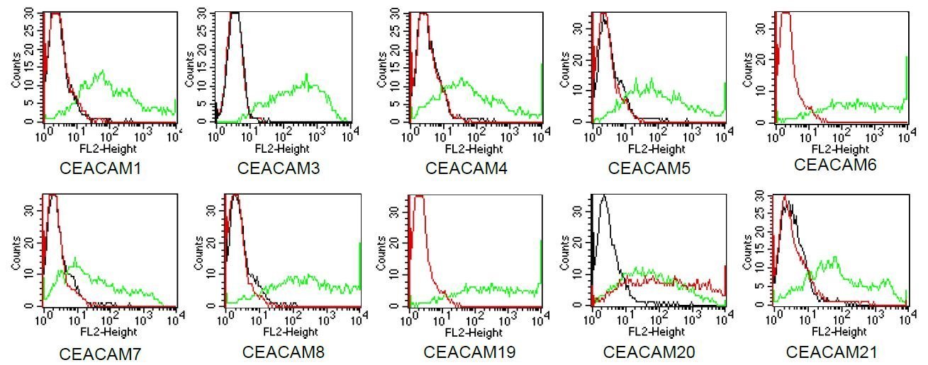- BOSC23 cells were transiently transfected with expression vectors containing either the cDNA of CEACAM1, CEACAM3-8 or CEACAM19-21. Expression of the constructs was tested with monoclonal antibodies known to recognize the corresponding proteins (CEACAM1,3,4,5 and 6: D14HD11; CEACAM7: BAC2; CEACAM8: Tet2; CEACAM19,21: ?-myc; CEACAM20: ?-flag; green curves). An irrelevant monoclonal antibody served as a negative control (black curves). For specificity testing, protein G-purified HT-12D8 was tested on all CEACAM transfectants. A positive signal was obtained only with CEACAM20 transfected cells (red curve).
