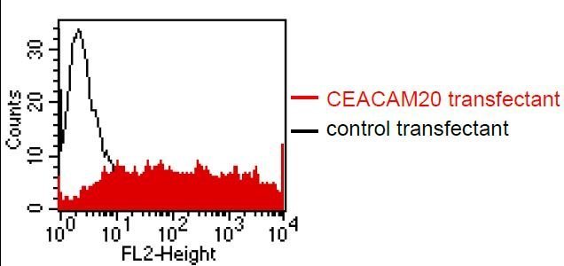 - FACS analysis of BOSC23 cells using HT-12D8. BOSC23 cells were transiently trans-fected with an expression vector encoding either CEACAM20 (red curve) or an irrelevant protein (control transfectant). Binding of HT-12D8 was detected with a PE- conjugated secondary antibody. A positive signal was obtained only with CEACAM20 transfected cells