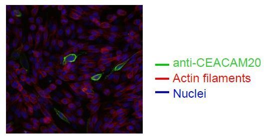 - Spectral Confocal Microscopy of CHO cells using HT-12D8. CHO cells were transiently transfected with an expression vector encoding CEACAM20. Binding of HT-12D8 was visualized with a FITC-conjugated secondary antibody (green). Actin filaments are labeled with Alexa Fluor-555 Phalloidin (red). Cell nuclei are stained with DAPI (blue).
