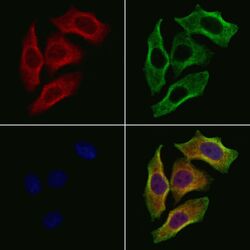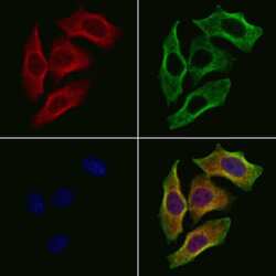 - Immunofluorescent analysis of CEACAM20 in HeLa cells. Samples were fixed with paraformaldehyde, permeabilized with 0.1% Triton X-100, blocked with 10% serum (45 min at 25°C), incubated with mouse anti-beta tubulin and CEACAM20 polyclonal antibody (Product # PA5-103711) using a dilution of 1:200 (1 hr, 37°C), and followed by goat anti-rabbit IgG Alexa Fluor 594 (red) and goat anti-mouse IgG Alexa Fluor 488 (green).