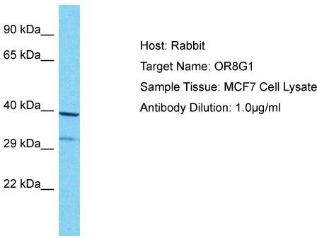 - Host: Rabbit; Target Name: OR8G1; Sample Tissue: MCF7 Whole Cell lysates; Antibody Dilution: 1.0ug/ml