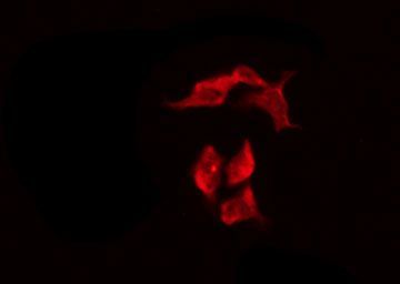 - Immunofluorescent analysis of OR8G1 in HeLa cells. Samples were fixed with paraformaldehyde, permeabilized with 0.1% Triton X-100, blocked with 10% serum (45 min at 25°C) incubated with OR8G1 polyclonal antibody (Product # PA5-102227) using a dilution of 1:200 (1 hr, 37°C), and followed by goat anti-rabbit IgG Alexa Fluor 594 at a dilution of 1:600.