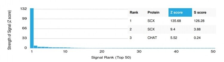 - Analysis of Protein Array containing more than 19,000 full-length human proteins SCXA Monoclonal Antibody (Product # 642658-MSM2-P1). Z- and S- Score: The Z-score represents the strength of a signal that a monoclonal antibody (MAb) (in combination with a fluorescently-tagged anti-IgG secondary antibody) produces when binding to a particular protein on the HuProtTM array. Z-scores are described in units of standard deviations (SD's) above the mean value of all signals generated on that array. If targets on HuProtTM are arranged in descending order of the Z-score, the S-score is the difference (also in units of SD's) between the Z-score. S-score therefore represents the relative target specificity of a MAb to its intended target. A MAb is considered to specific to its intended target, if the MAb has an S-score of at least 2.5. For example, if a MAb binds to protein X with a Z-score of 43 and to protein Y with a Z-score of 14, then the S-score for the binding of that MAb to protein X is equal to 29.
