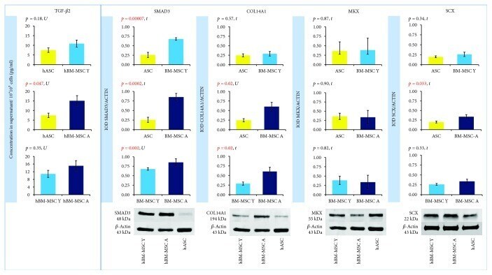 - Figure 5 The origin of cells affects the formation of proteins associated with tenogenesis. Left panel: TGF- beta 2 secretion determined by ELISA. Results shown as the concentration in the supernatant per 10 * 10 3 cells. Right panel: SMAD3, COL14A1, MKX, and SCX determined by Western blot. Expression of beta -actin was used as a loading control. The results shown as integrated optical density (IOD) normalized to IOD of corresponding beta -actin. Data presented as mean +- SEM. Statistical analysis was performed by Student's t -test ( t ) or Mann-Whitney U test (U). p < 0.05 was assumed to be statistically significant and highlighted in red. TGF- beta 2: TRANSFORMING GROWTH FACTOR BETA 2; SMAD3: SMAD FAMILY MEMBER 3; COL14A1: COLLAGEN TYPE XIV ALPHA 1; MKX: MOHAWK HOMEOBOX; SCX: SCLERAXIS.