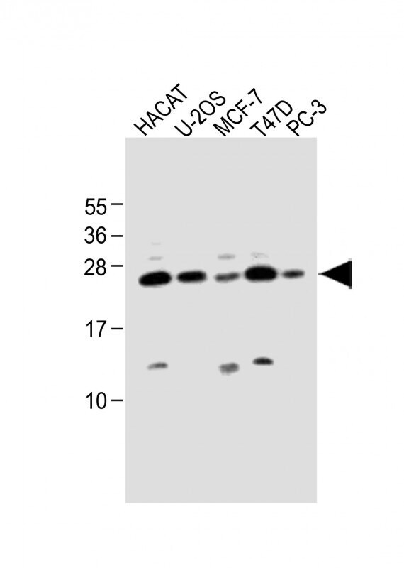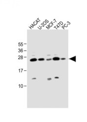 - Western blot analysis of SCXA in various lysates. Samples were incubated with SCXA polyclonal antibody (Product # PA5-23943) using a dilution of 1:1,000 followed by Goat Anti-Rabbit IgG, (H+L), Peroxidase conjugated at a dilution of 1:10,000. Lysates/proteins: 20 µg per lane. Lane 1: HACAT whole cell lysate; Lane 2: U-2OS whole cell lysate; Lane 3: MCF-7 whole cell lysate; Lane 4: T47D whole cell lysate; Lane 5: PC-3 whole cell lysate. Predicted band size: 22 kDa. Blocking/Dilution buffer: 5% NFDM/TBST.