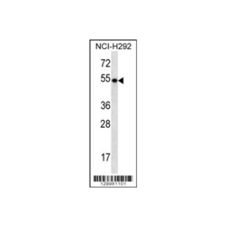 - TBC1D3E Antibody (C-term) (Cat. #OAAB08530) western blot analysis in NCI-H292 cell line lysates (35µg/lane).This demonstrates the TBC1D3E antibody detected the TBC1D3E protein (arrow).