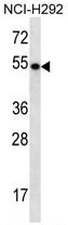 - TBC1D3E Antibody (C-term) western blot analysis in NCI-H292 cell line lysates (35ug/lane).This demonstrates the TBC1D3E antibody detected the TBC1D3E protein (arrow).