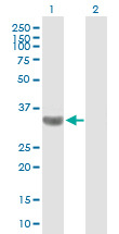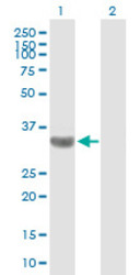 - Western Blot analysis of TBC1D3 expression in transfected 293T cell line (H00084218-T01) by TBC1D3 MaxPab polyclonal antibody.Lane 1: TBC1D3 transfected lysate(32.01 KDa).Lane 2: Non-transfected lysate.