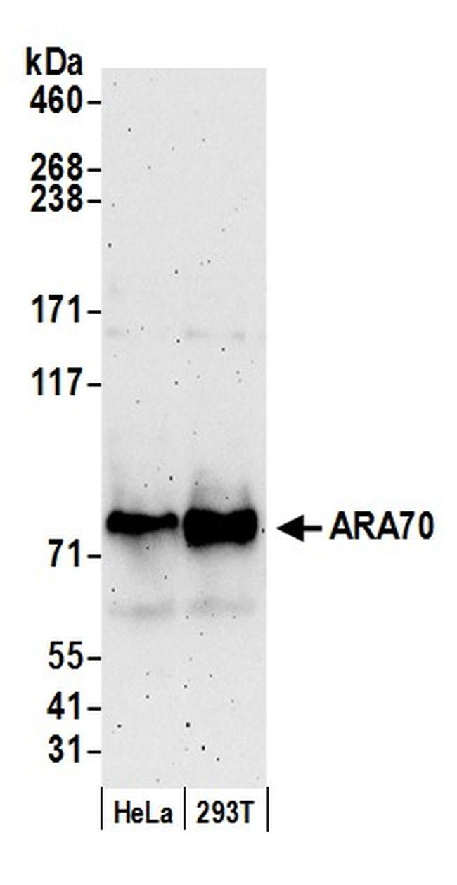 - Detection of human ARA70 by western blot. Samples: Whole cell lysate (50 µg) from HeLa and 293T cells prepared using NETN lysis buffer. Antibody: Affinity purified rabbit anti-ARA70 antibody A302-272A-M (lot A302-272A-M-2) used for WB at 1:1000. Detection: Chemiluminescence with an exposure time of 3 minutes.