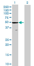 - Western Blot analysis of ZCCHC3 expression in transfected 293T cell line by ZCCHC3 MaxPab polyclonal antibody.Lane 1: ZCCHC3 transfected lysate(44.33 KDa).Lane 2: Non-transfected lysate.