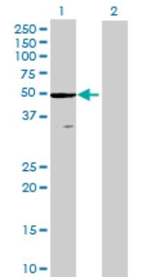 - Western Blot: ZCCHC3 Antibody [H00085364-B01P] - Analysis of ZCCHC3 expression in transfected 293T cell line by ZCCHC3 polyclonal antibody. Lane 1: ZCCHC3 transfected lysate(44.33 KDa). Lane 2: Non-transfected lysate.