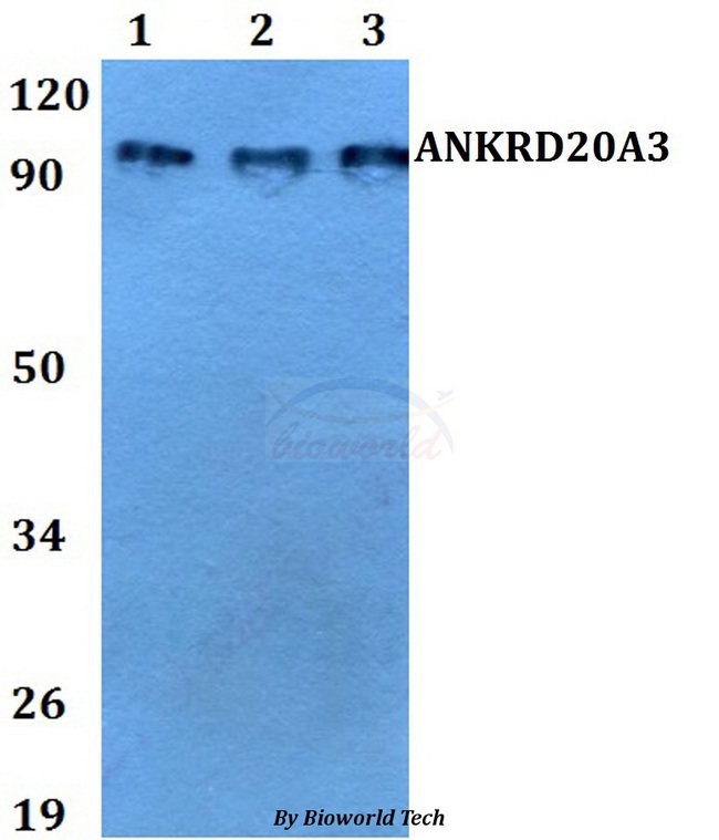 - Western blot of ANKRD20A3 antibody at 1:500 dilution. Lane 1: MCF-7 whole cell lysate. Lane 2: sp2/0 whole cell lysate. Lane 3: PC12 whole cell lysate.